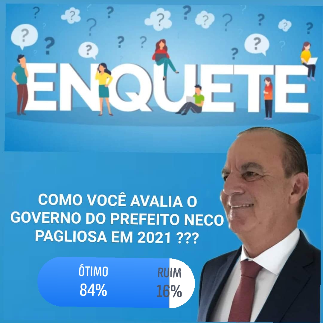 O Prefeito Neco Pagliosa ,foi considerado pelos internautas como um ótimo prefeito 84%Consideram ÓTIMO e apenas 16% consideram RUIM .