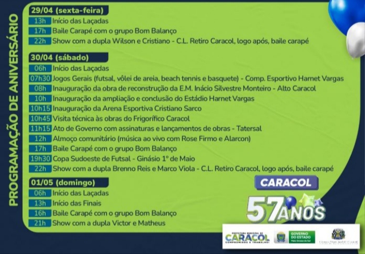 O prefeito de Caracol, Neco Pagliosa, anunciou nesta quinta-feira, 7 de abril, a programação oficial de aniversário dos 57 anos da emancipação político-administrativa do município, comemorado no dia 1º de maio.