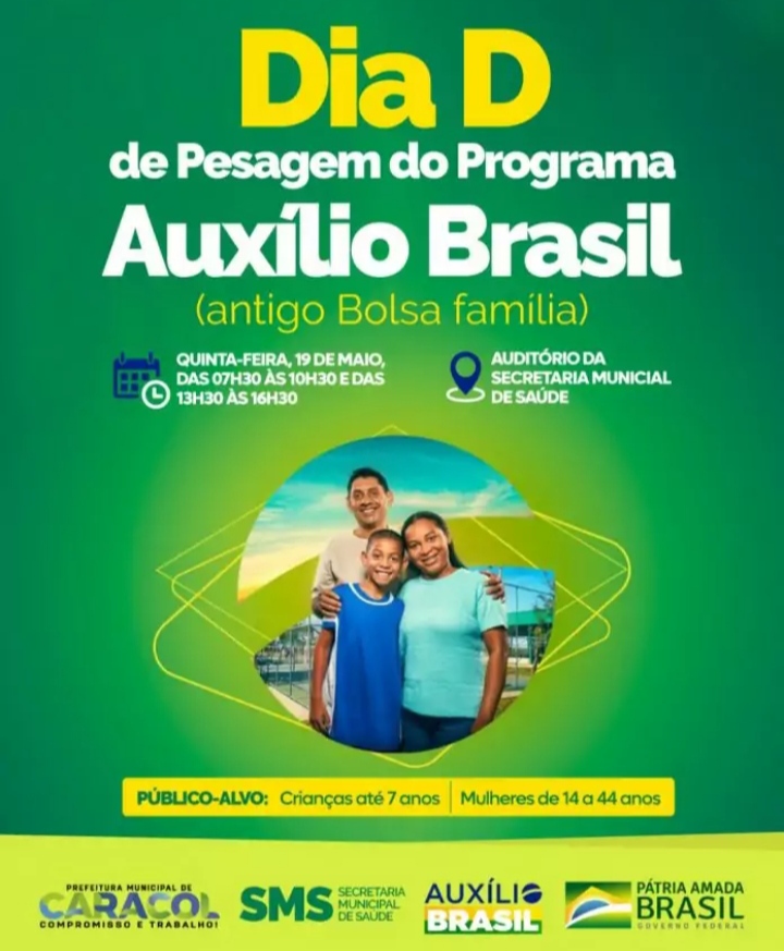 A Prefeitura de Caracol, por meio da Coordenação Municipal da Saúde do Programa Auxílio Brasil, antigo Bolsa Família, realiza no dia 19 de maio, o Dia D de Pesagem.
