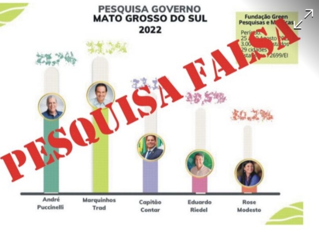 O suposto levantamento, feito pela “Fundação Green Pesquisas e Métricas”, e de responsabilidade do estatístico cujo registro seria 72699EI”, se trata de fake news, conforme representação feita pela Coligação Trabalhando por um Novo Futuro, que reúne o PSDB, Cidadania, Republicanos, PP, PSB, PL e PDT. Tanto o instituto quanto o número do estatístico não existem.