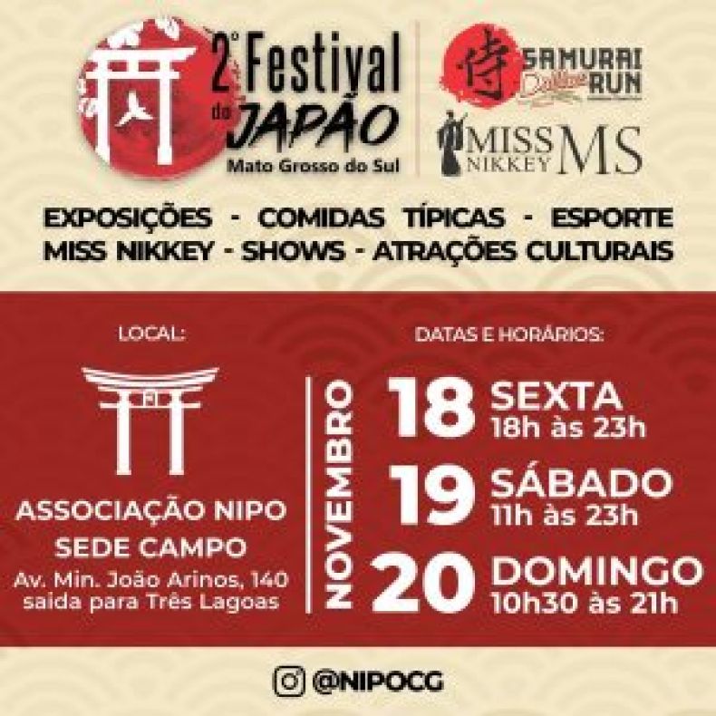 A cerimônia de abertura do evento acontece neste sábado, às 20h, e logo em seguida será realizado o Miss Nikkey MS, concurso que elegerá a mais bela nikkei da comunidade nipo-brasileira de Mato Grosso do Sul, que participará da final do Miss Nikkey Brasil, em julho de 2023, em São Paulo.