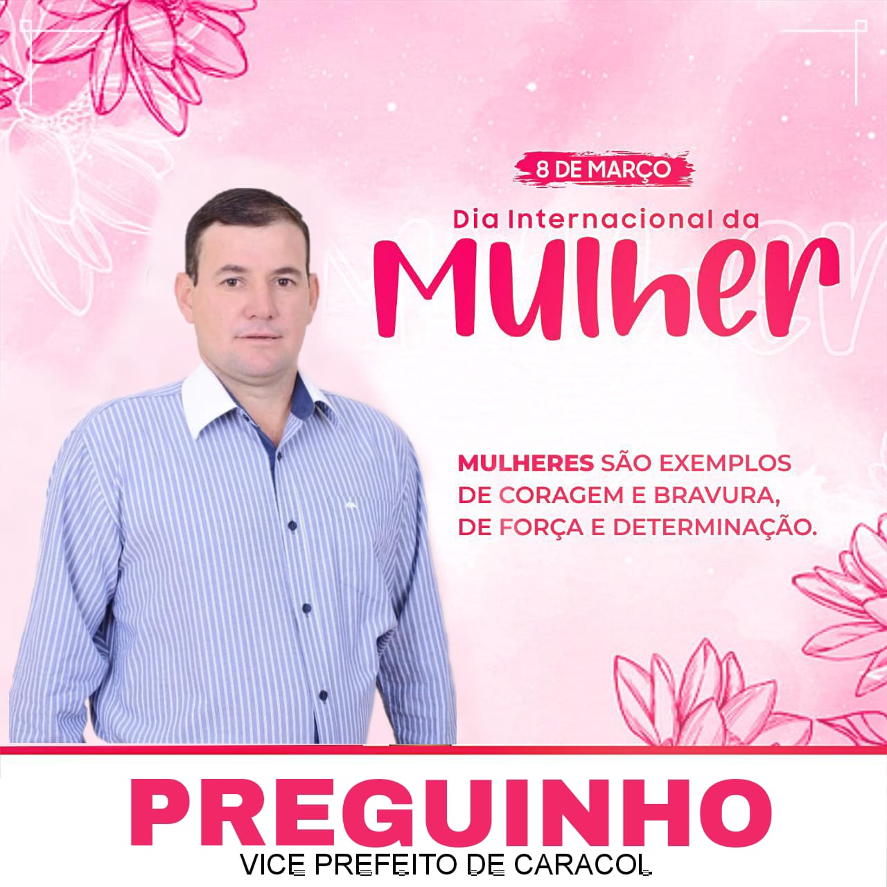Neste 8 de março, Dia Internacional da Mulher, quero deixar o nosso reconhecimento a todas as mulheres, em especial as mulheres Caracolenses, por contribuírem pelo crescimento de nossa cidade, por serem mulheres fortes, guerreiras, empreendedoras, e que estão sempre, presentes em cada passo, para novas conquistas.