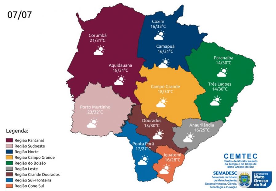 De acordo com o Cemtec (Centro de Monitoramento do Tempo e do Clima), em Campo Grande, a mínima será de 18°C e a máxima de 30°C. Em Dourados, 15°C pela manhã e 30ºC pela tarde. No leste do Estado, em Anaurilândia, os termômetros marcam 16°C inicialmente e sobem até os 29ºC. Em Ponta Porã terá 17°C cedo e a temperatura se eleva gradativamente até 27°C durante a tarde.