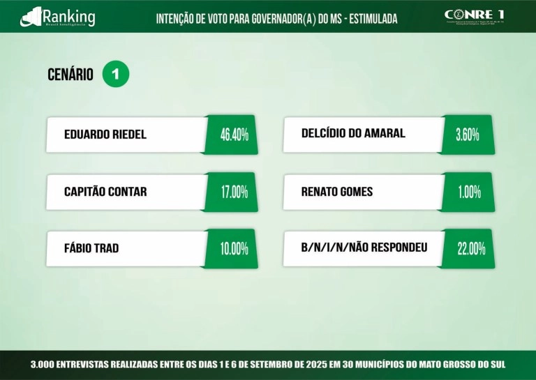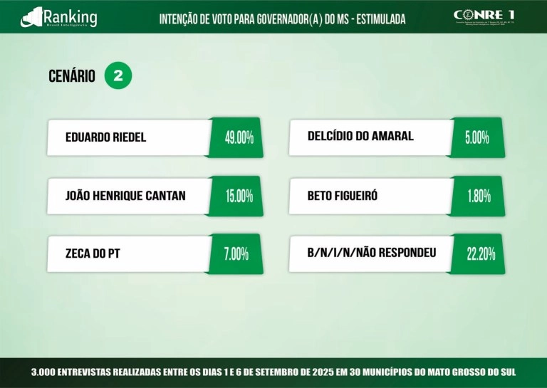 No segundo cenário analisado, Riedel chega a 49%, seguido por João Henrique Catan (PL), 15%; Zeca do PT, 7%; Delcídio do Amaral, 5%; e Beto Figueiró, 1,8%. Outros 22,2% não sabem ou não responderam.