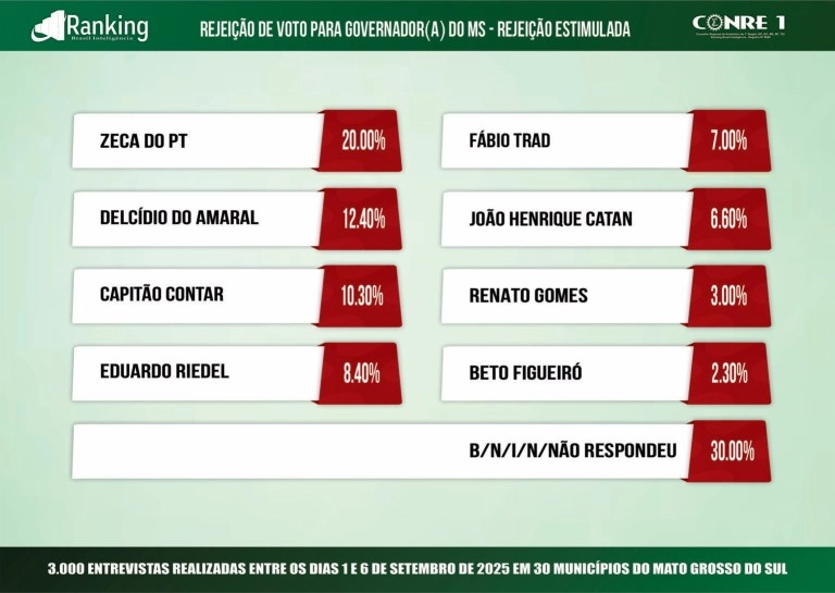 O instituto também perguntou em quem o eleitor não votaria. Zeca do PT foi o mais citado, com 20%. Depois aparecem Delcídio, com 12,4%; Contar, 10,3%; Riedel, 8,4%; Fábio Trad, 7%; Catan, 6,6%; Renato Gomes, 3%; Figueiró, 2,3%. Outros 30% não sabem ou não responderam.