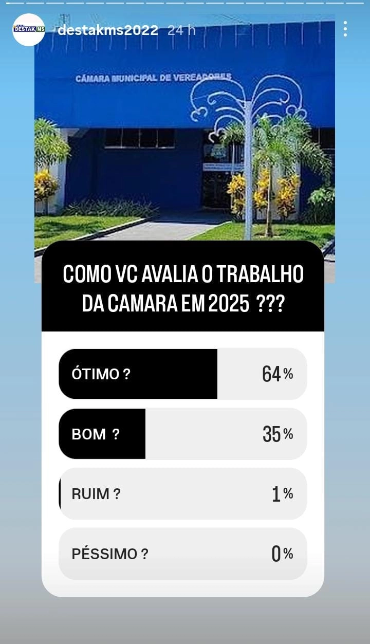 A enquete de avaliação da câmara municipal de Caracol de 2025, foi realizada nos dias 5,6,7 no Instagram e Facebook do Site e Jornal DESTAK MS que perguntou, como a população avalia o trabalho da câmara municipal de Caracol em 2025 ?