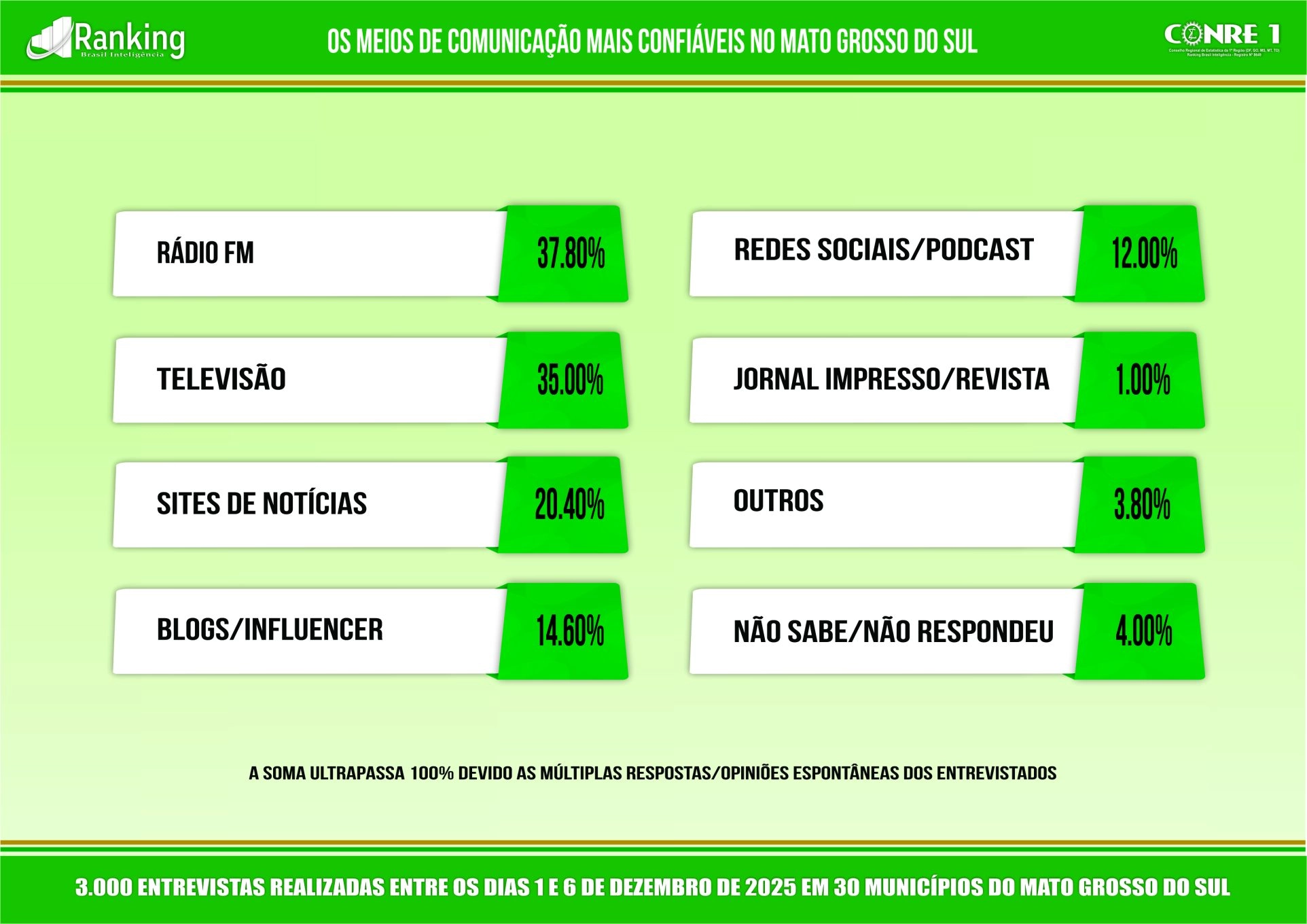 Por encomenda da Rede de Rádios Top FM, pesquisa realizada pelo Instituto Ranking Brasil Inteligência, de 1º a 6 de dezembro deste ano, junto a 3 mil moradores com 16 anos ou mais de idade, em 30 municípios de Mato Grosso do Sul, com intervalo de confiança de 95% e margem de erro de 1,8 ponto percentual para mais ou para menos, traz os meios de comunicação mais confiáveis do Estado, bem como as redes sociais mais utilizadas.