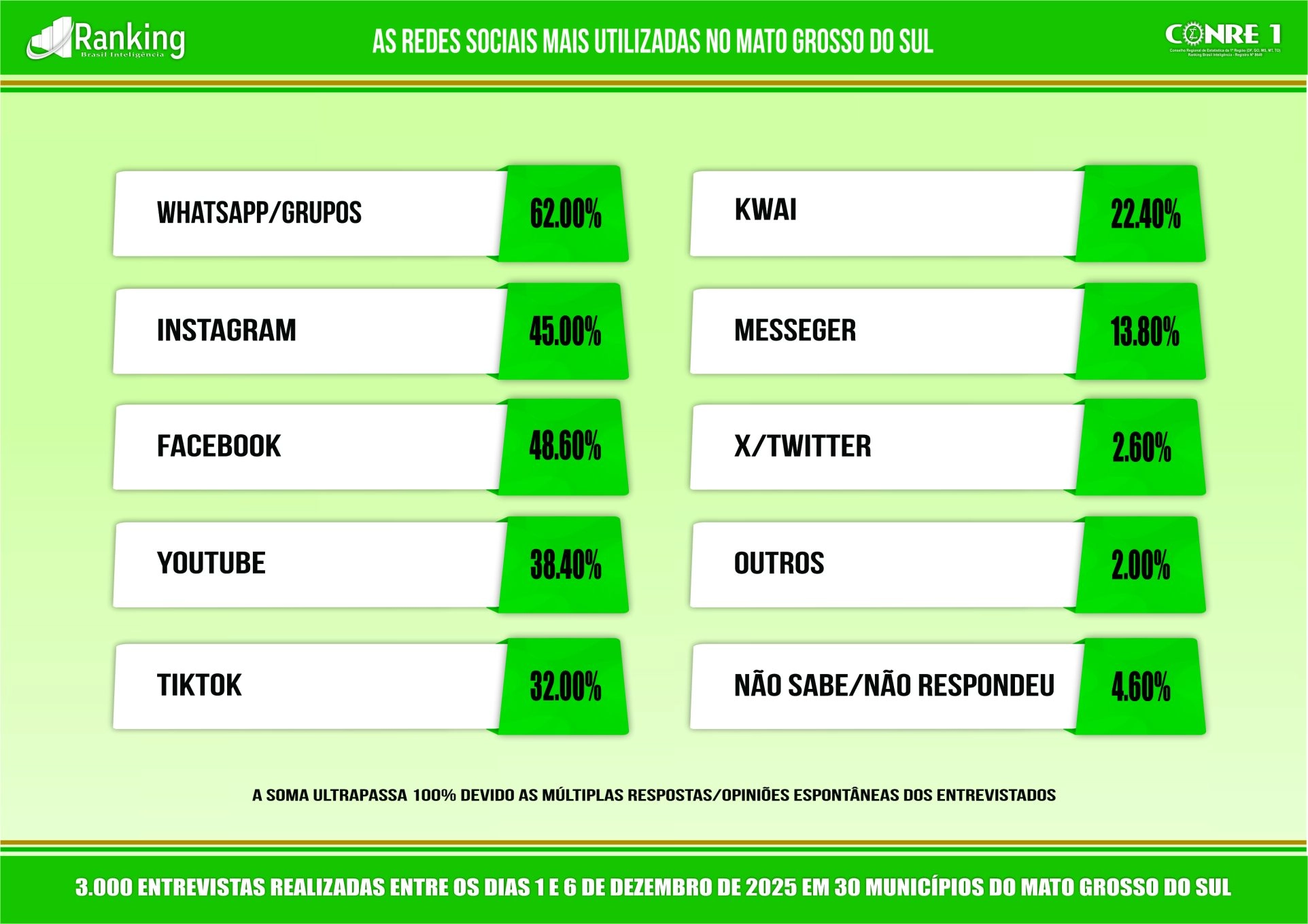 Com relação às redes sociais mais utilizadas de Mato Grosso do Sul, 62% dos entrevistados citaram o WhatsApp, depois aparecem Facebook, com 48,6%, Instagram, com 45%, YouTube, com 38,4%, TikTok, com 32%, Kwai, com 22,4%, Messenger, com 13,8%, e X (ex-Twitter), com 2,6%, sendo que 2% citaram outras redes sociais e 4,6% não sabem ou não responderam.