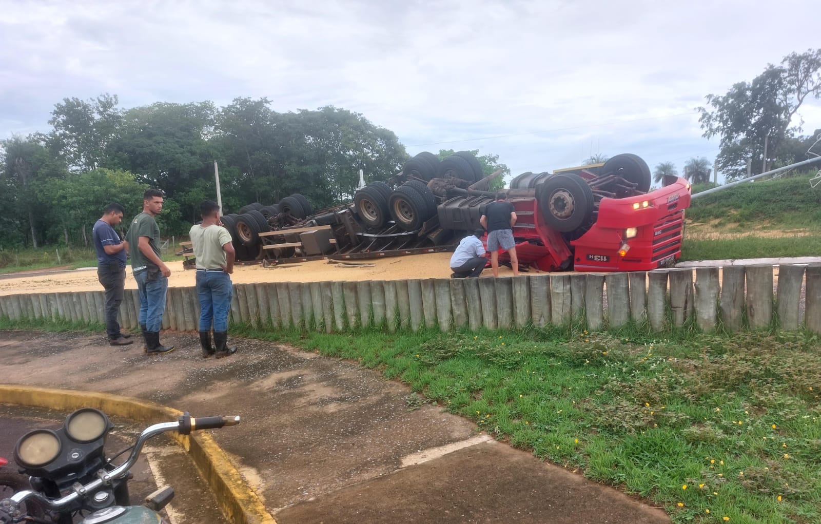 Mais um acidente: Carreta carregada com soja tomba na entrada de Caracol